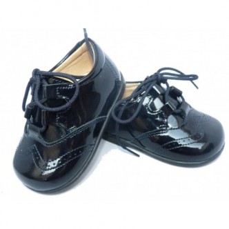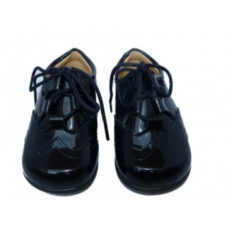 Zapato niño estilo inglés de piel charol. Disponible en color azul marino, gris o rosa. Zapato clásico, elegante y muy cómodo. Con cierre de cordones para un mejor ajuste.