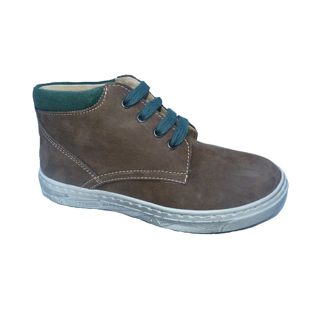 Bota de piel ante color marrón con detalles en color verde.Cierre cordones en color verde para un perfecto ajuste.Comoda y flexible,perfecta para el dia a dia. Suela de goma antideslizante.Fabricado en España.ANDANINES