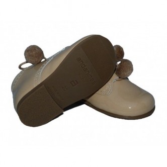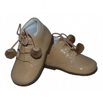 Botas de piel charol en color Sand Camel.Cierre cordón con adorno de pompones al tono.Un modelo clasico,ideal para cualquier ocasión y momento del dia.Perfecto para los primeros pasos.Suela de goma antideslizante. Fabricado en España.