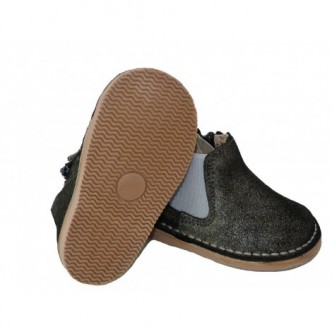 Botines de piel serraje estilo Chelsea en color Niquel con brillo.Cierre cremallera lateral.Un modelo comodo y practico para cualquier momento del dia.Suela de goma.Fabricado en España.