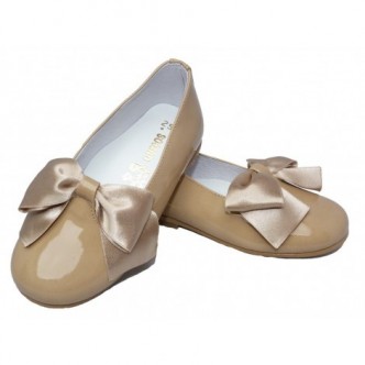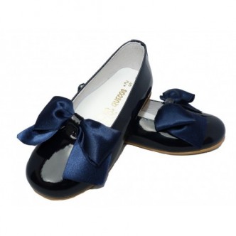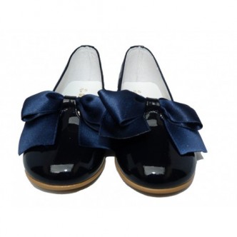 Zapatos Bailarinas de piel charol disponible en tres colores: Charol Rojo,Charol Azul Marino y Charol Sand Camel.Detalle lazo de raso al tono en la parte delantera.Un modelo original y elegante perfecto para cualquier celebración y momento.Suela de goma antideslizante.Fabricado en España.