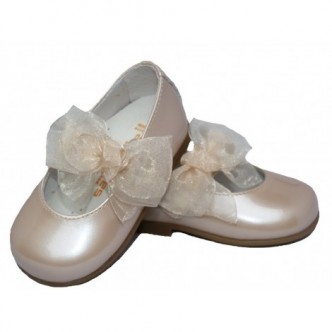 Merceditas piel charol en color Nude Rosa.Cierre velcro para un perfecto ajuste.Detalle lazo de organza al tono lateral.Clásico y elegante zapato perfecto para cualquier ocasión.Suela goma antideslizante.Fabricado en España.