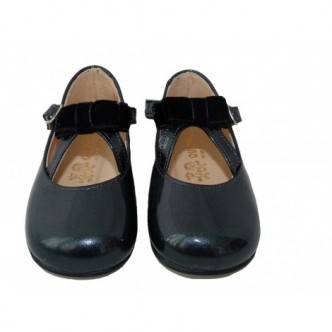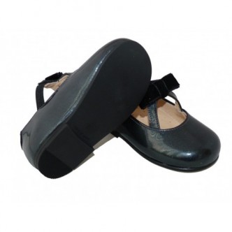 Merceditas de piel charol en color Silver Gris Oscuro.Detalle lazito de terciopelo en color negro y tiras cruzadas en la parte delantera.Cierre hebilla. Un modelo muy original y elegante,perfecto para cualquier ocasión.Suela de goma.Fabricado en España.