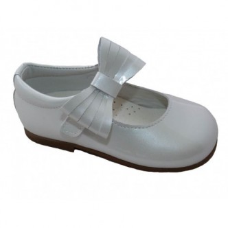 Merceditas piel charol en color Blanco.Cierre velcro para un perfecto ajuste.Detalle lazo de charol al tono en la tira.Clásico y elegante ideal para cualquier ocasión y acontecimiento.Suela de  goma antideslizante.Fabricado en España.