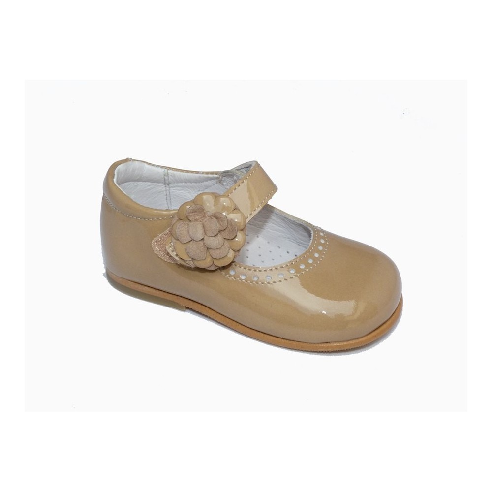 - Mercedita charol taupe con detalle de flor en el cierre de velcro.