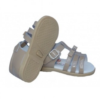 Sandalia de piel charol salinas camel.Tiras delanteras detalle lazito al tono en la parte delantera.Cierre hebilla para un perfecto ajuste.Talón cerrado para mayor sujeción.Suela goma antideslizante.Fabricado en España.