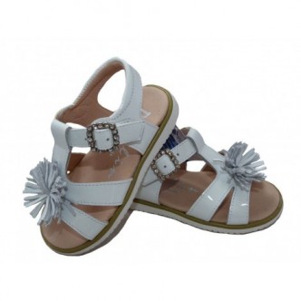 Sandalias de piel charol en color Blanco.Cierre hebilla.Detalle pompón al tono en la parte delantera.Un modelo original,perfecto para cualquier ocasión y momento.Comodo y ligero.Suela de goma blanca antideslizante.Fabricado en España.