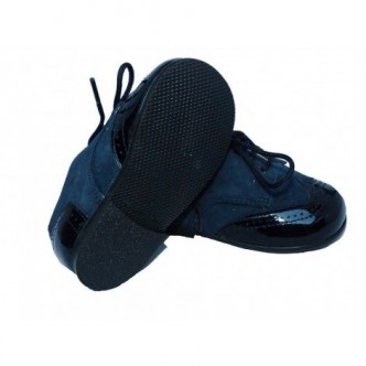 Zapatos de piel ante combinado con piel charol color azul marino. Elegante dibujo inglés. Cierre cordones. Suela de goma antideslizante. Fabricado en España.
